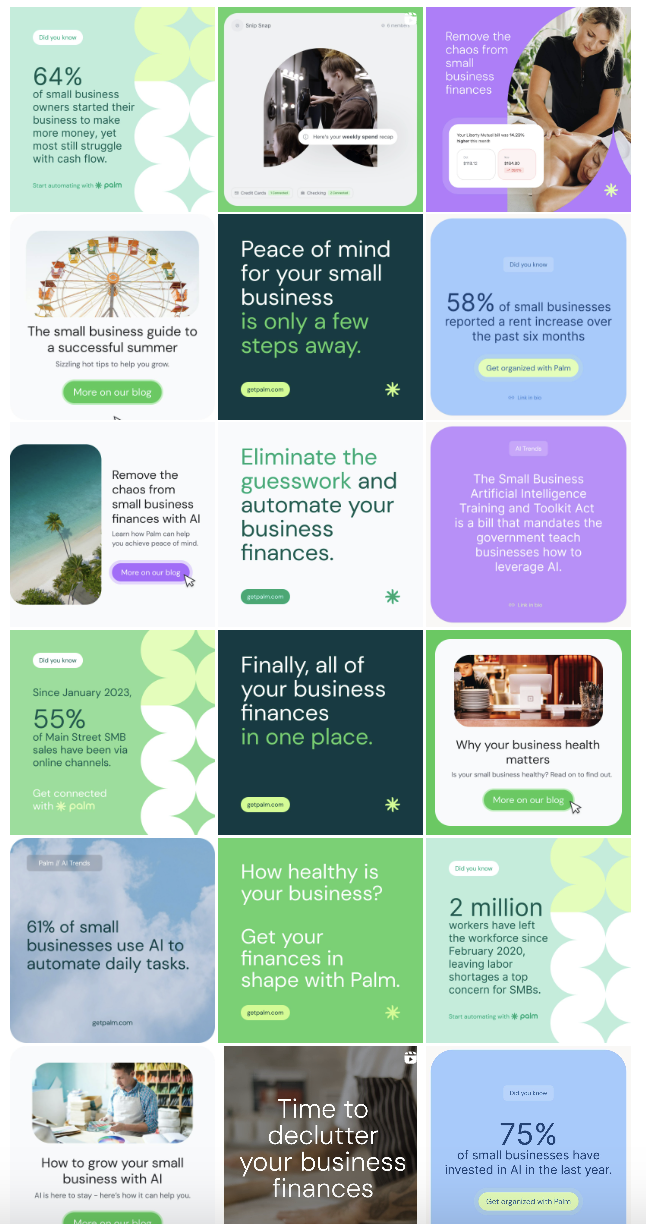 As part of our initial brand book, we build out a strategic brand house along with all core brand elements across channels, using Palm’s brand house rooted in data and strategy to create a beautiful brand rooted in a vision of peace and prosperity for small business owners everywhere.